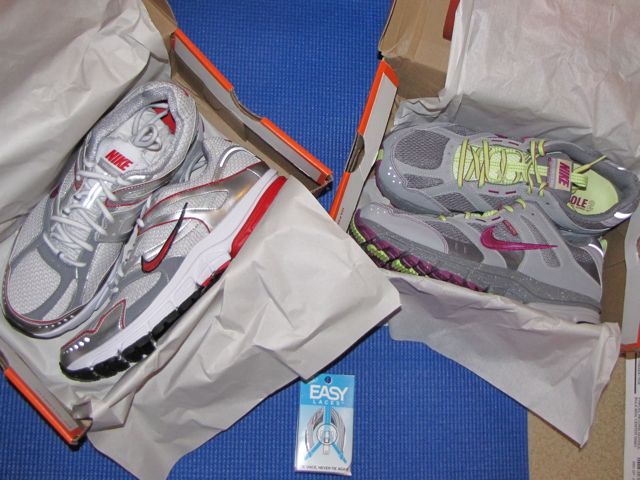 A new pair of Nike Structure Triax (left), the shoe that ended my shin splints so i'm sticking to like glue. While Road Runner Sports had free shipping I decided it was more economic to buy the trail running version of the same shoe (right - 'aint they pretty!) at the same time to get me psyched up for running in Maine - can I hear a woot woot? The difference I hear you ask - the trail running version is water-resistant (gore-tex), has a grippier sole, slightly more cushion and nifty things like a sewn in tongue to stop water getting in there. And they are purple. Why oh why don't they make the road running version in purple? Why oh why don't my feet and legs like running shoes that are actually purple? Since the rest of my life is purple, there is a mystery....